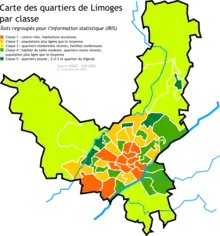 L'Insee compte ainsi cinquante-et-un quartiers à Limoges[2], d'environ 2 000 habitants chacun. Identifiés sous le terme générique d'îlots regroupés pour l'information statistique, ces quartiers à destination statistique sont classés en cinq classes. La première, qui totalise 36 170 habitants, comprend quinze quartiers, essentiellement du centre-ville : C.H.U, Carnot, Hôtel de ville, La Borie, La Cathédrale, La Visitation, Le Champ de Foire, Le Mas-Loubier, Le Roussillon, Les Charentes, Les Émailleurs, Les Galeries, Les Halles, Sainte-Claire et Valadon. La deuxième classe regroupe une population hétérogène et relativement
