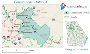 Le district nouvellement dessiné conserve son statut majoritairement afro-américain et comprend de nombreuses banlieues est d'Atlanta, telles que Conyers, Covington, Decatur, Lilburn et Lithonia. Une partie de la ville de Snellville (ainsi que des zones non incorporées) avec la même adresse) est également incluse dans le district[1],[2].