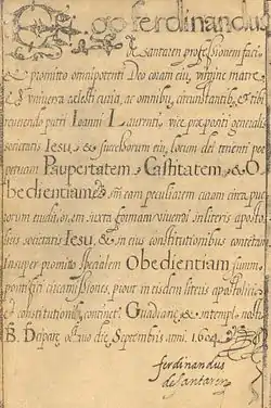 Dans un document de 1545 Ignace de Loyola indique l’importance qu’il donne au vœu : il en parle comme du «commencement et fondement principal de la Compagnie de Jésus»[3]