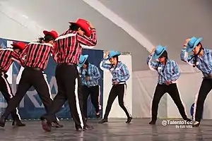 On le nomme "quebradita" à la flexion qui est réalisée après avoir exécuté le pas de cette danse, à un rythme de cumbión au compte d'un technobanda.