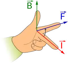 Inversement, la main droite est utilisée pour la règle du démarreur, utilisée dans les machines électriques (un démarreur est un moteur) : un conducteur alimenté en courant dans un champ magnétique subit une force perpendiculaire, dite de Laplace[1].