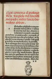 La règle de saint Benoît est une règle monastique écrite par Benoît de Nursie pour donner un cadre à la vie cénobitique de ses disciples. Rédigée en 530[1], elle établit un mode de vie monastique (organisation de la liturgie, du travail, des repas et de la détente entre autres) qui provient de son expérience d'abbé à Subiaco, puis au mont Cassin en Italie. Elle divise la journée en trois parties : la prière, le travail et la lectio divina (« lecture divine »), soit la lecture des textes sacrés. Ce qui la caractérise le plus est sa « discrétion », c'est-à-dire son équilibre, sa souplesse, son souci de ne pas faire peser sur les disciples un joug trop contraignant.