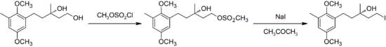 En usage moderne, la définition de la réaction a été étendue à la conversion des alcools en halogénures d'alkyle, en convertissant d'abord l'alcool en ester de sulfonate (tosylates ou mésylates en général), puis en opérant la substitution. l’exemple ci-dessous est tiré d'une synthèse de l'acide chrysochlamique[4] :