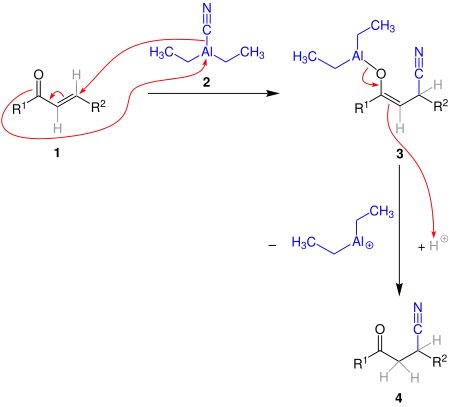 Le mécanisme réactionnel est résumé ci-dessous. Le composé carbonylé α,β-insaturé (1) commence par attaquer le cyanodiméthylaluminium (2). Une liaison s'établit entre l'atome d'aluminium et l'atome d'oxygène du carbonyle, dont la double liaison est ouverte, tandis que la double liaison α,β se déplace vers l'atome d'oxygène et que le groupe nitrile se lie au carbone β (3). La double liaison est ouverte par protonation pour donner le produit 4 en libérant l'ion diéthylaluminium (CH3CH2)2Al+[2].