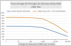 Lorsque les noyaux d’un faisceau accéléré interagissent avec ceux d’une cible fixe, les lois de conservation ci-dessus donnent une limite maximale à la part de l’énergie cinétique disponible pour la réaction. La figure ci-dessous donne cette limite dans l’hypothèse (rarement atteinte) où les deux noyaux fusionnent complètement, sans émission de particules.