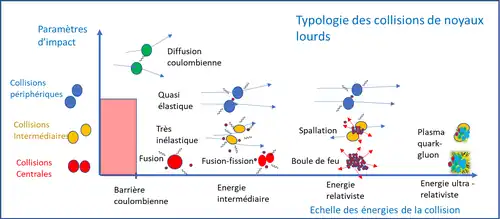 Il en résulte une très grande variété de phénomènes[2]. Par exemple : à basse énergie, création de deux noyaux en sortie, proches des noyaux initiaux ; à plus haute énergie, multifragmentation (noyaux légers et nucléons isolés) et création de particules élémentaires nouvelles ; dissociation des nucléons eux-mêmes aux énergies ultrarelativistes.