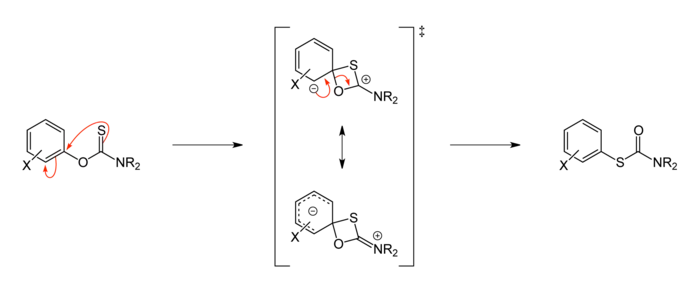 Le réarrangement de Newman-Kwart (parfois aussi « réarrangement thiono-thiolo ») est une réaction de réarrangement dans laquelle, à température élevée ou sous catalyse, un groupe aryle d'un O-arylthiocarbamate (thionuréthane, ArOC(=S)NRR') migre depuis l'atome d'oxygène vers l'atome de soufre, formant un S-arylthiocarbamate (thioluréthane, ArSC(=O)NRR')[1],[2],[3]. Cette réaction est nommée d'après les chimistes américains Melvin Spencer Newman[4] et Harold Kwart[5] qui l'ont observés pour la première fois sur des thiocarbamates en 1966. Une réaction similaire avait cependant déjà été observée sur les esters de thioacides par le chimiste allemand Alexander Schönberg (de) en 1930[6],[7].