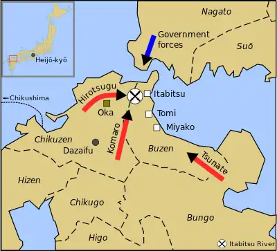 Afin d'encercler les forces gouvernementales, Hirotsugu divise son armée en trois unités : l'une sous son commandement et les autres sous le commandement de ses subordonnés, respectivement Tsunade et Komaro. Ensemble, ils avancent le long de différentes routes vers le nord de Kyūshū où le détroit de Kanmon sépare Kyūshū de Honshū, l'île principale du Japon. En route, le [d 5], Hirotsugu s'arrête au quartier général du district d'Oka pour « dresser le camp, préparer ses arbalètes, élever les signaux de balise et former les conscrits de la province de Chikuzen »[8]. Finalement, il arrive aux fortifications (chinsho) dans le district de Miyako, province de Buzen près de la route d'invasion attendue[8]. Mais les plans de Hirotsugu pour une attaque organisée sont déjoués parce qu'une armée de plusieurs milliers d'hommes n'arrive pas et qu'une autre unité est en retard. L'armée gouvernementale débarque avec succès sur Kyūshū, s'empare d'hommes et d'armes dans les trois camps de Tomi, Itabitsu et Miyako dans la province de Buzen[d 6],[1]. Plus tôt, l'armée de la cour a été renforcée les 16/[d 7] de plus de 4 000 hommes dont 40 bons soldats (jōhei) du district de Toyoura dans la province de Nagato[1]. Le [d 8], plusieurs alliés de Hirotsugu se rendent et changent de camp : quatre fonctionnaires du district font défection avec 500 guerriers à cheval et un citoyen de la province de Buzen tue un des rebelles. Plus tard, un officiel d'un district de Buzen revient avec les têtes de plusieurs rebelles tués à la bataille[1]. Le [d 9], un décret impérial est distribué parmi la population et les responsables de Kyūshū, en vue de discréditer Hirotsugu et promettant des récompenses à qui le tuerait[nb 5]