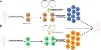 La création de lymphocytes allogéniques, pouvant être administrés à un grand nombre de patients, est également explorée et a déjà permis de soigner avec succès[3]. Les traitements Yescarta et Kymriah, commercialisés aux États-Unis en 2017, utilisent cette approche.