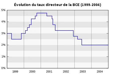 La Banque centrale européenne établit un taux directeur à 3 % au qui est abaissé trois mois plus tard à 2,5 %. À partir du la BCE décide de relever ses taux pour lutter contre l'inflation. Plusieurs relèvements successifs sont opérés au cours des années 1999 et 2000 et le taux directeur finit par atteindre 4,25 % le .