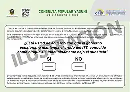 L'arrêt de l'exploitation pétrolière reçoit le soutien des candidats Daniel Noboa, Christian Zurita, Jan Topić, Otto Sonnenholzner et Yaku Pérez[35]. Daniel Noboa justifie sa position en se basant sur l'analyse des banques internationales selon laquelle le cour moyen du pétrole équatorien ne devrait pas dépasser 70 dollars le baril au cours des cinq années restantes d'exploitation, une somme insuffisante pour justifier la poursuite de l'exploitation au vu des conséquences environnementales. Il affirme vouloir compenser la perte de revenus par un plan de réduction des coûts de transport, la restructuration de la fiscalité et la lutte contre la corruption dans les entreprises publiques[35].