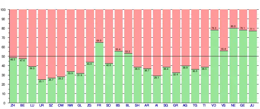 L'adhésion de la Suisse à l'Espace économique européen est acceptée par la population des six cantons de la Suisse romande (Fribourg, Genève, Jura, Neuchâtel, Valais et Vaud), ainsi que par celle des deux demi-cantons alémaniques de Bâle-Ville et de Bâle-Campagne[2]. Les autres cantons de Suisse alémanique et le canton du Tessin disent majoritairement non[2].