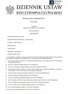 Le , le parquet de Varsovie entame une enquête « pour manquement par omission depuis le », par les fonctionnaires publics, aux obligations résultant de l'article 190 alinéa 2 de la Constitution et de l'article 3 de la loi du sur la publication des actes normatifs et certains actes juridiques. L'omission de la publication sans délais d'un jugement du Tribunal constitutionnel peut constituer un délit contre l'intérêt public (article 231 §1 du Code pénal)[34].