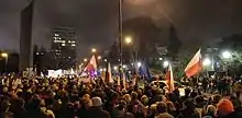 Le , le Comité de défense de la démocratie(KOD) organise le premier piquet d'appui pour le Tribunal constitutionnel[42]. Le , des manifestations organisées par le KOD ont eu lieu dans plusieurs villes. Dans les rues de Varsovie, des milliers des manifestants marchent, avec à leur tête des militants du KOD et des politiciens de l'opposition. Ils protestent contre le comportement de la majorité parlementaire et du président de la République de Pologne envers le Tribunal constitutionnel. Cette marche commence devant le siège du Tribunal constitutionnel, pour ensuite se diriger vers le bâtiment de la Diète et le Palais Présidentiel. Selon les estimations de différentes sources, à cette marche participent entre 17.000 et 50.000 personnes [43],[44].
