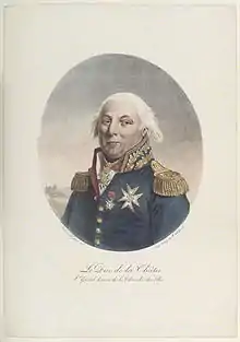 Le comte Claude-Louis de La Châtre (° 1745- † 1824), est inspecteur de la cavalerie en Guyenne quand il est élu député de la noblesse du bailliage de Bourges (Berry) aux États-généraux[1]. Émigré en 1791, il fait la campagne de 1792 dans l’armée de Bourbon. Passé en Angleterre, il devient propriétaire et colonel du régiment Loyal-Émigrant, et fait toutes les campagnes des émigrés avant de devenir, en 1807, le représentant de Louis XVIII auprès du roi d’Angleterre, puis par la suite il est ministre d'État et duc[1].