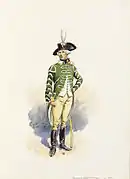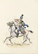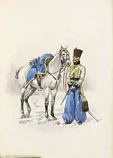 Pelisse, parements et retroussis du dolman blancs, dolman, surtout et pantalon bleu céleste, gilet rouge, tresses et boutons jaunes, manteau vert, schakos doublés en bleu[1].