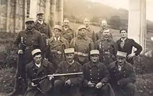 Affecté à la garde des dépôts et des ponts entre Thionville et Metz jusqu'au [29]. Sept prisonniers sont exécutés par les Allemands le 17 à Sainte-Suzanne[30]. Le régiment défend Montbéliard le 18[29]. Replié à Cajarc et Figeac[15], une partie du régiment est internée en Suisse[31],[32]. | ||