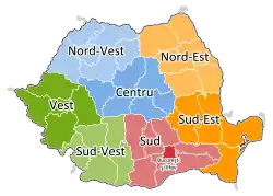 La Roumanie est composée de huit régions de développement nommées d'après leur position géographique. Elles sont regroupées au sein de quatre macro-régions numérotées, mais qui ont aussi dans les médias des noms vernaculaires issus des régions historiques qu'elles regroupent :