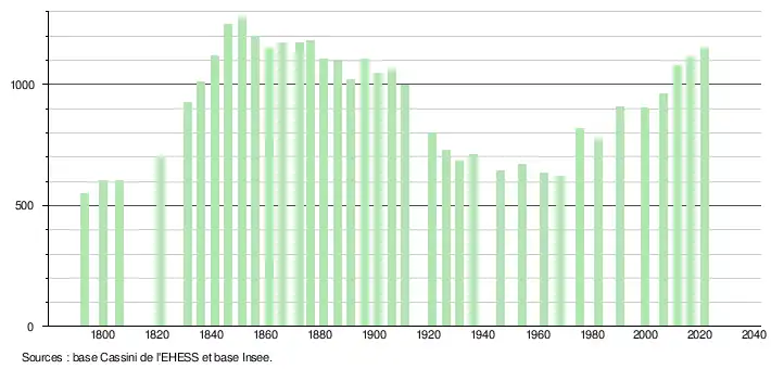 L'évolution du nombre d'habitants est connue à travers les recensements de la population effectués dans la commune depuis 1793. Pour les communes de moins de 10 000 habitants, une enquête de recensement portant sur toute la population est réalisée tous les cinq ans, les populations légales des années intermédiaires étant quant à elles estimées par interpolation ou extrapolation[16]. Pour la commune, le premier recensement exhaustif entrant dans le cadre du nouveau dispositif a été réalisé en 2006[17].