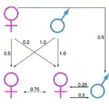 Où VS directe = succès reproducteur propre de l'individu et où VS indirecte = l'aide liée au succès reproducteur à un individu apparenté.Si on prend par exemple le comportement d'assistance des jeunes vers leurs parents pour élever ses frères et sœurs, le taux de reproduction du jeune assistant se verra diminué au profit d'une fitness augmentée car la transmission de ses gènes à la génération suivante est de 0,5.