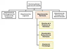 Pour réaliser ses missions, le Département du patrimoine compte trois directions : la Direction de l’archéologie, la Direction de la protection du patrimoine et la Direction de la restauration du patrimoine.
