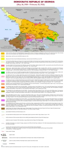 Au nord et au nord-ouest, depuis le début de la guerre civile russe jusqu'à l'établissement du pouvoir soviétique en Ciscaucasie, la Géorgie partage des frontières avec plusieurs entités ethniques qui éprouvent des difficultés à se fédérer. Dans un premier temps l'Armée blanche de Dénikine est à la recherche d'un territoire qui servirait de base à la reconquête de la Russie : le conflit éclate en Abkhazie le et le gouvernement géorgien fait donner son armée nationale en cours de formation, renforcée par la garde populaire. Une médiation est tentée par la mission militaire britannique, désireuse d'unir toutes les forces antibolchéviques de la région : elle dessine une ligne imaginaire traversant le Caucase et que l'Armée blanche n'a pas le droit de franchir. Cette situation contribue à la signature d'un accord mutuel de défense le entre la république démocratique de Géorgie et la république démocratique d'Azerbaïdjan, la république démocratique d'Arménie ne s'y associe pas considérant que le danger ottoman est plus fort que le danger russe[9]. Dans un deuxième temps le traité de Moscou du est censé fixer la frontière entre la république démocratique de Géorgie et la Russie soviétique.