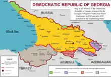 Au sud-ouest, la frontière de la république démocratique de Géorgie avec l'Empire ottoman change continuellement : l'offensive ottomane sur le Caucase -— encouragée par le traité de Brest-Litovsk du signé entre l'Empire allemand et la Russie soviétique — conduit à la signature le d'un traité turco-géorgien cédant Akhalkali, Akhaltsikhé et Batoumi. Parallèlement le gouvernement obtient la protection de l'Empire allemand dont les troupes débarquent à Poti le ; 3 000 hommes sont déployés sous le commandement de Friedrich Freiherr Kress von Kressenstein ; ils seront évacués après l'armistice de la Première Guerre mondiale, non sans avoir abandonné une partie de leur matériel militaire. Les Britanniques — mandatés par les puissances alliées — débarquent le à Batoumi et déploient leurs régiments le long de la ligne de chemin de fer menant à Bakou ; ils atteignent Tiflis le . Le traité de Sèvres du — défavorable à l'Empire ottoman — donne le contrôle des districts d'Artvin et d'Ardahan, du Lazistan oriental (districts de Rize et de Hopa), des districts d'Akhaltsikhe et d'Akhalkalaki, ainsi que de la région de Batoumi au gouvernement géorgien ; il sera déclaré caduc par les révolutionnaires turcs menés par Mustapha Kémal lorsqu'ils prendront le pouvoir à Ankara. En définitive, seuls Akhaltsikhé et Akhalkali resteront sous contrôle géorgien, ainsi que Batoumi à la suite de la dernière victoire, le , de l'armée nationale géorgienne (sous commandement du général Guiorgui Mazniachvili) sur l'armée ottomane[10].