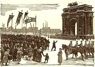 Le 9 janvier 1905 ( dans le calendrier grégorien) (dimanche rouge), un cortège pacifique d'ouvriers pétersbourgeois vers le palais d'Hiver fut dispersé à Saint-Pétersbourg. Des armes à feu furent utilisées contre les ouvriers désarmés. La dispersion du cortège, provoquant des dizaines ou des centaines de victimes, déclencha un mouvement de révolte dans la société russe et marqua le point de départ de la première révolution russe.