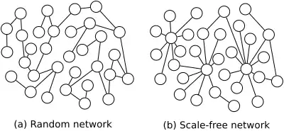 - Le réseau World Wide Web, dont l'étude, par Barabási et Albert[5] a donné naissance au terme scale-free network. Dans ce cas une dichotomie est faite entre les hub qui sont les nœuds les plus reliés, et les autres nœuds.