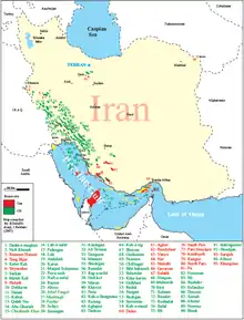 En 2009, selon un rapport de issue du gouvernement iranien, 78 des champs pétroliers iraniens sont actifs, dont 62 champs terrestres et 16 au large. Un nombre significatif de champs sont inactifs. Quelque 23 champs d'hydrocarbures se trouvent dans les zones frontalières et sont partagées entre l'Iran et les pays voisins, dont le Koweït, l'Irak, le Qatar, Bahreïn, les Émirats arabes unis, l'Arabie saoudite et le Turkménistan[3].