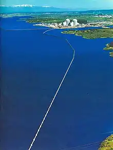 Les eaux, captées du Tage, circulent, une fois chargées de la chaleur dégagée par les générateurs de la centrale, le long d'un circuit en U formé par des murs, des digues et des écrans (pantallas). Ces écrans, ou murs de séparation thermique, d'une hauteur de 8 m et d'une longueur de 11 km[3], permettent à l'eau de suivre une route de 25 km de long au cours de laquelle celle-ci se refroidit peu à peu avant d'être de nouveau rejetée dans le Tage (voir le schéma de circulation). Ces murs ressortent par-dessus les eaux du réservoir et servent de perchoirs et dortoirs aux cormorans, entre autres oiseaux.