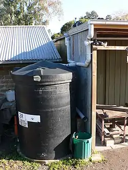 De plus petits réservoirs, tels que les barils en plastique (208 litres (55 US gal) -) sont également utilisés dans certains cas. Des systèmes modulaires modernes et évolutifs, comme le module Rainwater HOG de 193 litres (51 gal US)[9] et le Stratco Aquabarrel de 500 litres (133 gallons)[10] peut être utilisé pour décentraliser le captage des eaux pluviales en stockant de plus petits volumes à chaque descente pluviale. Les réservoirs plus grands sont couramment utilisés là où il n'y a pas d'accès à un approvisionnement en eau centralisé. Des entreprises comme Solar Survival Architecture recommandent un réservoir de 1 135 litres pour une maison de deux personnes (si des toilettes à compost sont placées) et si la région reçoit au moins 762 mm (30,0 po) de précipitations par année. S'il en reçoit moins (entre 254 et 762 mm (10 à 30,0 po), 2 ou 3 de ces réservoirs de 300 gallons peuvent être placés de façon à recueillir plus de pluie lorsqu'il pleut. Affectant également la taille du réservoir, les précipitations prévues, la variabilité des précipitations, les prix plus élevés pour les grands réservoirs, l'utilisation prévue de l'eau de pluie et la consommation typique pour ces utilisations, la zone de drainage du toit à destination du réservoir, la sécurité d'approvisionnement souhaitée.