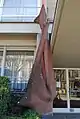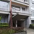 L’entrée regroupe les portes piétonne et carrossable. Elle est ornée d’une sculpture de Frans Lamberechts en béton rouge, soulignant une double antenne T.V et radio, et d’un auvent en béton bouchardé à la forme fine et élancée.