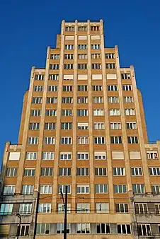 Surnommé « tour Chicago » (The Chicago Building) en raison de son profil en gradins symétriques, le bâtiment se compose avant tout de béton mais sa façade est principalement recouverte de brique de Boom avec de la pierre blanche, sur les pinacles, de la pierre grise et du granit de Suède sur le parement du rez-de-chaussée[8]. Hergé s'en serait d'ailleurs inspiré pour représenter Chicago dans Tintin en Amérique[9].