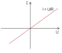 Un conducteur ohmique est un modèle physique des composants électroniques sus-mentionnés (dipôles appelés « résisteurs » ou « résistances »). Un conducteur ohmique est un dipôle qui vérifie la loi d'Ohm :
