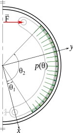 Dans le cas d'un frein à tambour à mâchoire intérieure (frein de tambour de voiture) ou extérieur, on considère que la pression de contact varie selon le sinus de l'angle polaire θ (θ = 0 pour le pivot du sabot) :
