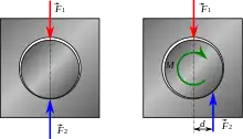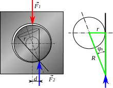 Au départ, il y a adhérence ; l'arbre « roule » dans le palier et « monte la côte ». Les forces F1 et F2 ne sont plus colinéaires mais sont sur deux axes parallèles, distants d'une distance d ; comme nous sommes à l'équilibre, on a