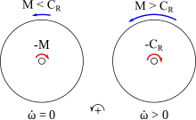 Considérons un système tournant, auquel on applique un couple moteur de moment M. En dessous d'une valeur seuil CR, les phénomènes résistants créent un couple s'opposant exactement au couple moteur ; le système reste immobile (s'il s'agit d'un démarrage) ou bien ralentit (s'il s'agit d'un système déjà en mouvement). Au-delà de cette valeur, le couple résistant garde une valeur constante égale à CR (ou légèrement inférieure), donc l'accélération angulaire est dans le sens du mouvement. Toutefois, les phénomènes de frottement fluide augmentent avec la vitesse, le couple résistant peut donc croître avec la vitesse.