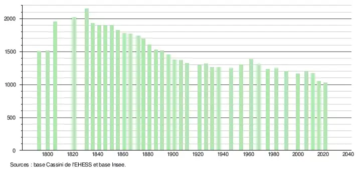 L'évolution du nombre d'habitants est connue à travers les recensements de la population effectués dans la commune depuis 1793. Pour les communes de moins de 10 000 habitants, une enquête de recensement portant sur toute la population est réalisée tous les cinq ans, les populations légales des années intermédiaires étant quant à elles estimées par interpolation ou extrapolation[43]. Pour la commune, le premier recensement exhaustif entrant dans le cadre du nouveau dispositif a été réalisé en 2006[44].