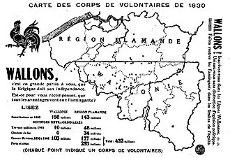 Ducpétiaux et Lucien Jottrand remplacent partout les drapeaux français, l'étendard orange de la famille royale hollandaise reste encore l'emblème officiel, leur mot d'ordre n'étant pas encore l'indépendance, mais la "séparation administrative" de la Belgique et des Pays-Bas tout en maintenant l'union dynastique[61],[53]. Ailleurs le drapeau français est aussi remplacé par les couleurs locales. À Verviers, c'est l'étendard franchimontois vert et blanc qui flotte au vent et dans toute l'ancienne principauté de Liège, de Dinant à Ciney en passant par Thuin, le drapeau jaune et rouge de l'ancien état ecclésiastique est arboré. À Mons et Tournai, ce sont respectivement les drapeaux blanc et rouge et rouge avec une tour blanche qui sont arborés pour empêcher les rattachistes d'y placer un drapeau français[62]. À Bruxelles et dans d'autres villes, on exhibe les couleurs brabançonnes noir-jaune-rouge, partout on chante La Marseillaise jusqu'à la création de La Brabançonne[53].