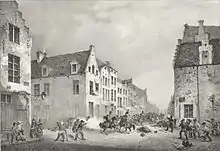 Le même jour, le prince d'Orange convoqua à Vilvorde les personnalités présentes à Bruxelles, ainsi qu'Emmanuel Van der Linden d'Hooghvorst, qui se fit accompagner de cinq membres du conseil de la garde bourgeoise. Le prince fit savoir qu'il exigeait l'abandon immédiat des couleurs brabançonnes et qu'il entrerait le lendemain dans Bruxelles avec son armée[66] . En apprenant la nouvelle, le peuple de Bruxelles commença à dresser des barricades dans les rues. Le soir, la garde bourgeoise envoya une nouvelle délégation auprès des princes, pour les convaincre de renoncer à leur projet. Guillaume d'Orange décida finalement de rentrer dans Bruxelles sans ses troupes, accompagné uniquement de son état-major, sous la protection de la garde bourgeoise[67] . Le lendemain, le prince constata l'hostilité du peuple de Bruxelles à la dynastie et se laissa convaincre par la garde bourgeoise de plaider auprès de son père la cause de la séparation administrative des provinces du Nord et du Sud. Il retourna donc aux Pays-Bas. Guillaume Ier ne réagit pas pendant plusieurs semaines.