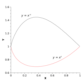 Graphe des fonctions y = xx (rouge, en bas) et y = x−x (gris, en haut) sur l'intervalle ]0 ; 1].
