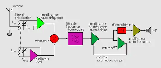 Un récepteur superhétérodyne est constitué essentiellement de quatre parties : un oscillateur local, un mélangeur qui mélange le signal de l'oscillateur local avec le signal reçu, un filtre fixe et un amplificateur de fréquence intermédiaire accordé (les parties centrales du schéma ci–dessous). Pour optimiser les coûts, on peut utiliser des éléments actifs pour l'oscillateur local et le mélangeur. Cet étage est parfois appelé converter.