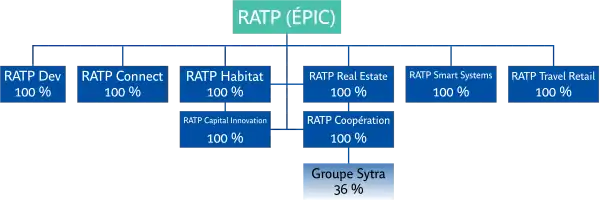 | Filiales | RATP Cap Île-de-France RATP Capital Innovation RATP Connect (ex-Telcité) RATP Coopération (ex-RATP i) RATP Dev RATP Habitat (ex-Logis-Transports) RATP Real Estate (ex-SEDP) RATP Smart Systems (ex-Ixxi) RATP Travel Retail (ex-Promométro) |