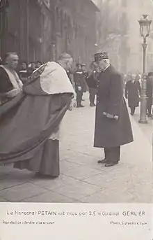 Le courant passe bien entre Philippe Pétain et certains prélats de l'Église catholique française, qui se pressent pour lui rendre visite à Vichy. En tête de ces évêques et cardinaux maréchalistes, le cardinal Gerlier, primat des Gaules. La doctrine catholique de l'époque, et notamment sa composante sociale, a largement inspiré la révolution nationale, et le cardinal Gerlier déclare d'ailleurs : « Travail, Famille, Patrie, ces trois mots sont les nôtres ». Depuis la fin du XIXe siècle, la France avait connu des gouvernements pour lesquels l'étiquette de « laïque » était plus ou moins synonyme d'anticlérical. L'Église catholique romaine en France comptait bien profiter d'un gouvernement favorable pour marquer quelques points, notamment en matière d'enseignement religieux.