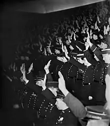 Au cours de la Seconde Guerre mondiale, cette collaboration prend plusieurs formes : coopération économique, arrestations de résistants, de francs-maçons, d'ecclésiastiques catholiques, et d'opposants politiques (notamment communistes), rafles de Juifs français et étrangers, réfugiés en France avec la montée du nazisme dans les années 1930, sur le territoire métropolitain, remis aux Allemands et déportés vers les camps d'extermination nazis. Sur le plan militaire, le régime n’est pas un allié officiel du Troisième Reich mais le sixième gouvernement Laval reconnaît la Légion des volontaires français (LVF) comme une association d’utilité publique[8] et contribue aussi à l’effort de guerre allemand au moyen de la collaboration de son industrie militaire. Il fournit en outre à l’occupant une force armée supplétive de répression en métropole, avec la Milice française, responsable d'exactions meurtrières sur tout le territoire. Au regard du peu de troupes d'occupation allemandes réparties sur un territoire aussi grand que la France, l'ordre nazi n'aurait pu s'exercer sans la totale implication de toute la machine étatique, policière et administrative française alors sous les ordres du régime de Vichy, ce qui reste un exemple unique dans les pays d'Europe occupés.