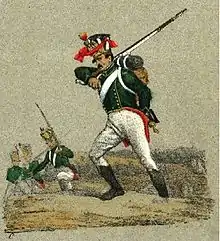 Flanqueur[6], subst. masc. Mot dont le substantif flanc est l'origine ; il exprime des soldats ou des corps qui, en temps de guerre, sont chargés d'éclairer les flancs d'une armée, de garder les ailes d'une troupe. Il a existé dans l'Infanterie de la Garde impériale des régiments de flanqueurs, mais ils ne l'étaient que de nom.