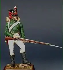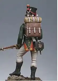 Le shako est orné d'un galon blanc en forme de V. L'aigle de plaque est le même que celui alors commun au sein de la garde impériale, que cela soit pour les petites tenues des grenadiers de la Garde impériale et autre. forme du pompon en boule. Le cordon natté à raquette est de couleur écarlate pour la troupe, doré pour les officiers et écarlate et jonquille pour les sous-officiers. Le pompon est écarlate et jonquille, le port du plumet rouge se retrouve chez le sapeur, le tambour-maître et les officiers subalternes, le fifre a un plumet blanc avec cordon et raquettes de la même couleur[1].L'habit à revers carrés et droits, en drap vert avec passepoils jonquille ; les parements de manche sont verts à passepoil jonquille ; doublure écarlate, passepoil jonquille ; retroussis garnis de quatre aigles. Dans les plis de taille, pattes d’oie en drap vert liseré de jonquille. Veste et pantalons blancs, guêtres en bottes. L'équipement et l'armement était comme les tirailleurs[4]. Le fusil standard de l'infanterie était le modèle de l'an IX (de à selon le calendrier révolutionnaire utilisé jusqu'en 1805) avec garnitures en acier poli. C'était une variante du modèle 1777, qui se chargeait par le canon. Sa longueur hors tout était de 152 cm, son calibre de 17,5 et son poids d'environ 4,5 kg. La balle sphérique pesait 20 g. La baïonnette (la "fourchette" comme on l'appelait dans le jargon de la Grande Armée) était longue de 46,5 cm, à douille avec une lame triangulaire et une virole de fixation. Un baudrier en cuir blanchit, soutenant la giberne (sacoche à cartouches) portée sur l'arrière de la hanche droite, avec une attache pour la baïonnette côté gauche. La giberne est timbrée d’un aigle couronné, renferme un bloc de bois contenant deux paquets de 15 cartouches chacun et au centre, 6 trous pour les cartouches individuelles. Elle était, en outre, dotée d'une poche pour l'outillage nécessaire à l'entretien du mousquet et pour les pierres à feu, y compris une "pierre à feu" en bois pour l'exercice. Le havresac en cuir tanné, poils au-dessus, était porté sur le dos et attaché aux épaules par des courroies. Le havresac renfermait tous les biens du soldat, et une liste d'équipement datant de 1811 fait état du fait que le modèle de la garde était plus grand que celui de la ligne. Porté sous la giberne, le bonnet de police était tenu par 2 courroies en cuir. Le schako de la Jeune Garde des flanqueurs-grenadiers portait des chevrons blancs sur les côtés et avait un pompon en boule, moitié jonquille en haut, écarlate en bas. Le cordon à raquette était écarlate.