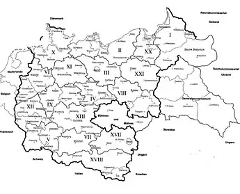 Au début de la guerre, l'Allemagne compte quinze régions militaires, portant les numéros I à XIII, plus les XVII et XVIII ; deux Wehrkreise furent ajoutés après la campagne de Pologne, les WK XX et XXI. Et enfin, deux nouveaux Wehrkreise furent ajoutés en 1942, le Wehrkreis Böhmen-Mähren qui incluait tout le protectorat de Bohême-Moravie, et le Wehrkreis Generalgouvernement qui contenait les régions polonaises non intégrés dans les WK XX et XXI. À partir de la fin de 1942, le Großdeutsches Reich est subdivisée en dix-neuf Wehrkreise.