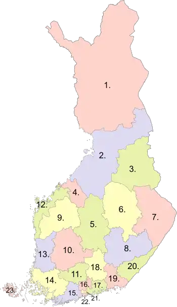 Selon la loi sur la mise en œuvre et l'application de la réforme des services sociaux et de santé et de secours, les 21 zones de protection sociale suivantes sont créées en Finlande à compter du 1er juillet 2021. La ville d'Helsinki et la province d'Åland ont la responsabilité d'organiser les services sociaux et de santé et de secours sur leurs territoires respectifs[3],[10].